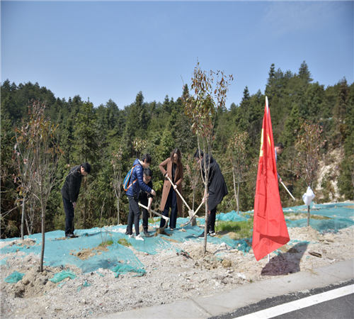 三月的天岳幕阜山,春光明媚,萬物勃發。在天岳幕阜山景區燕天公路沿線,參加活動全體人員揮舞著手中的鋤頭、鏟子,在裸露的沙土上種上水杉、杜鵑、映山紅等適合景區生長的樹木。大家一起,分發樹苗,鏟土挖坑,覆土澆水,共植樹200余棵。